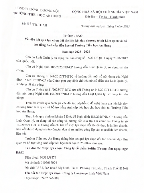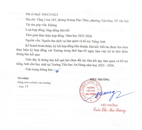 Kết quả lựa chọn đối tác liên kết chương trình Tiếng Anh - Toán cấp tiểu học tại Trường Tiểu học An Hưng năm học 2025 - 2026