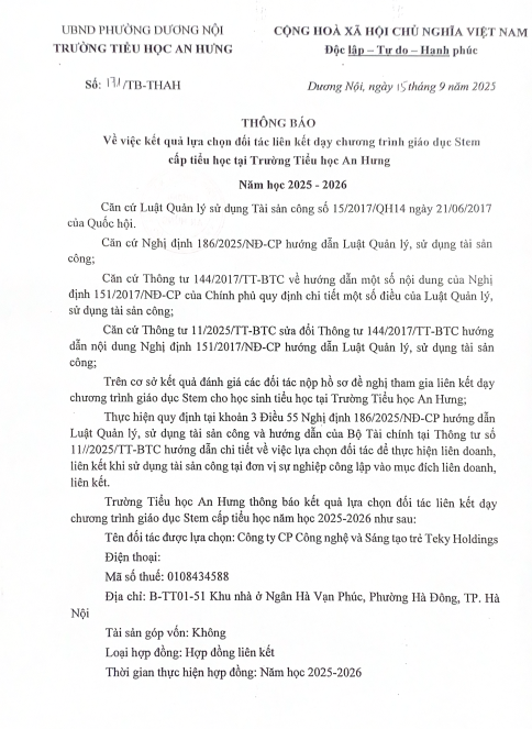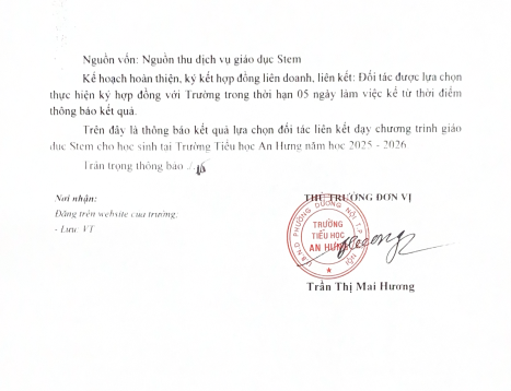 Kết quả lựa chọn đối tác liên kết chương trình giáo dục STEM cấp tiểu học tại Trường Tiểu học An Hưng năm học 2025 - 2026